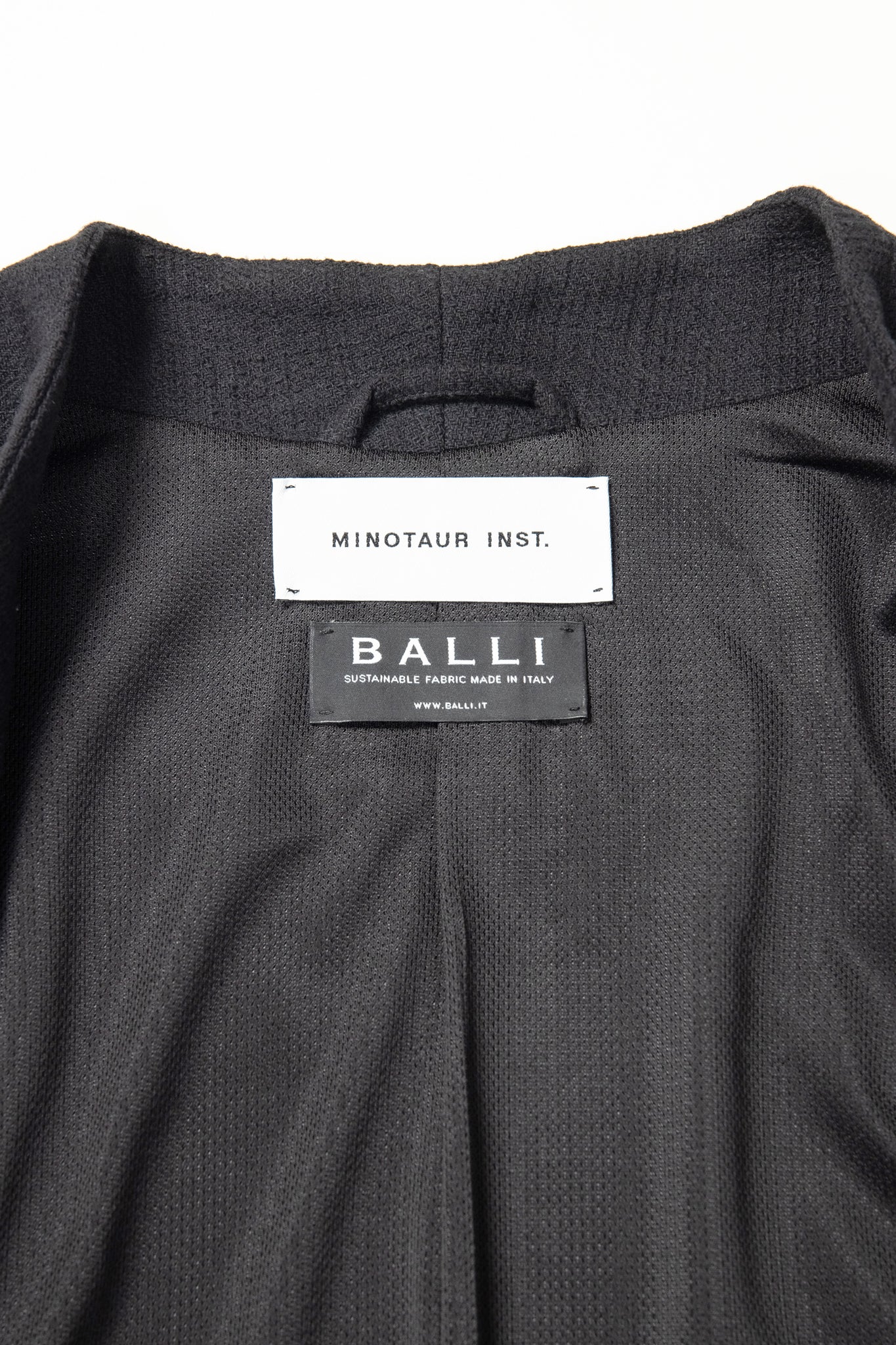 フロントは留め具のないミニマルな仕様とし、背面にはシルバーで施した MINOTAUR INST. 刺繍ロゴをさりげなく配置。